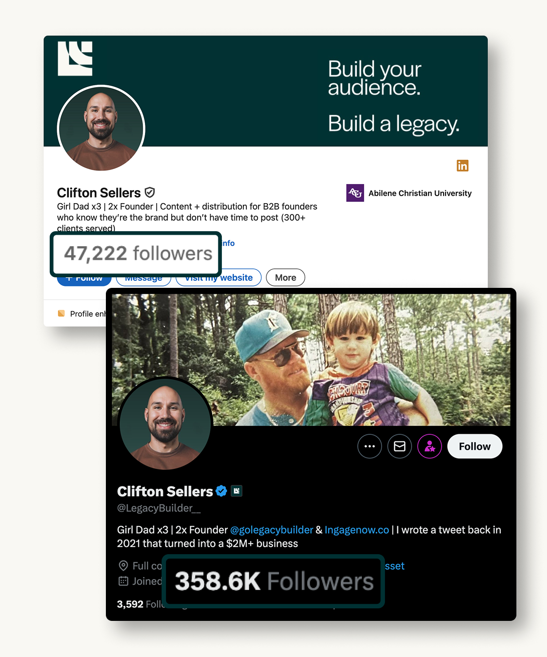 Personal brand strategist and founder of Legacy Builder - a multimillion-dollar content and personal branding agency that has helped hundreds of B2B founders transform from unknown experts to recognized industry authorities. With an audience of over half a million people across platforms, Clifton has mastered the exact strategies he'll be teaching you.
